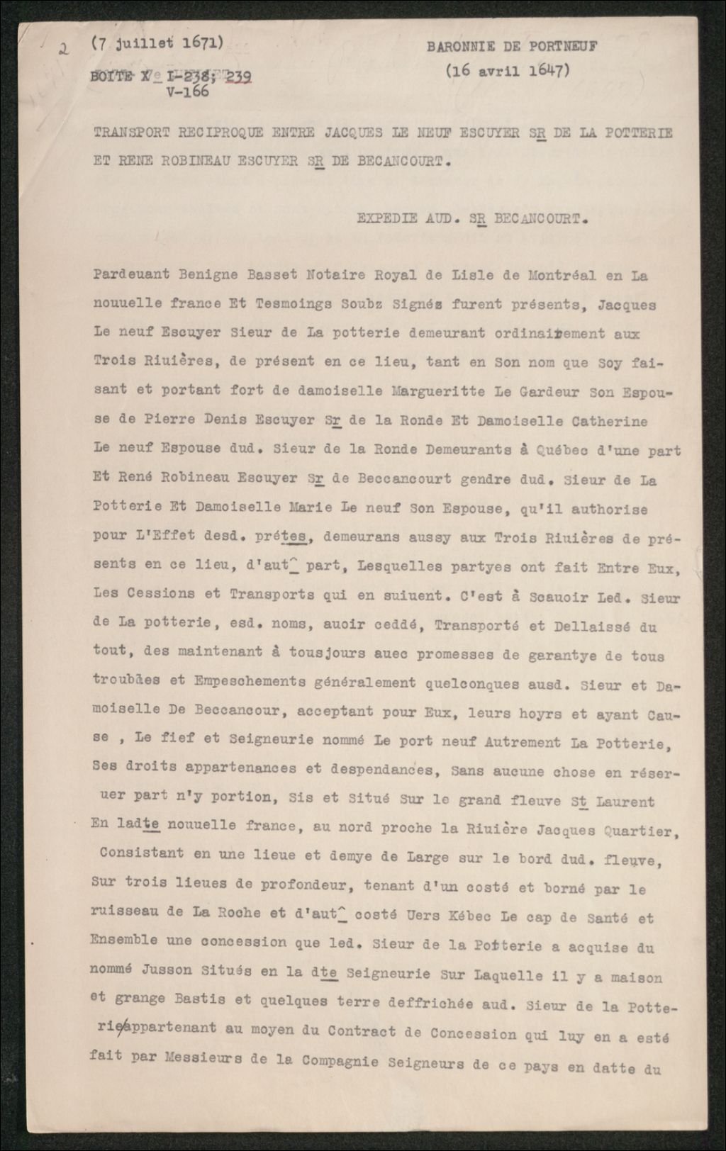 Aveu et dénombrement de messire René Robineau, chevalier de Bécancour, grand voyer de la Nouvelle-France, pour le fief et seigneurie de Portneuf qu'il a obtenu de son beau-père, le sieur de la Poterie, le 7 juillet 1671, Copie dactylographiée en [19-] original créé le 3 septembre 1677, Archives nationales à Québec, Collection Seigneuries, (03Q,P240,D237,P2).