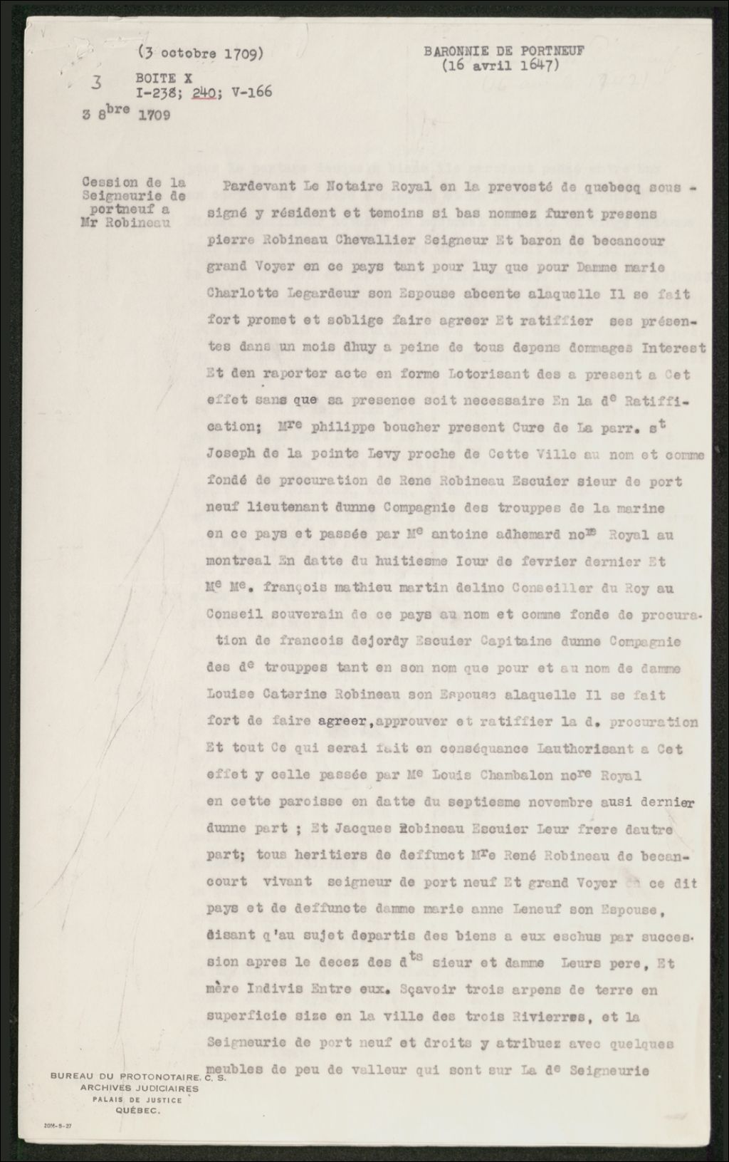 Acte de transaction et partage entre Pierre Robineau, baron de Portneuf, grand voyer en ce pays, messire Philippe Boucher, curé de Saint-Joseph de la Pointe-Lévy, fondé de pouvoir de René Robineau de Portneuf, et Martin de Lino, fondé de procuration de François Desjordy et de Louise-Catherine Robineau, son épouse, et Jacques Robineau, tous héritiers de René Robineau de Bécancour, baron de Portneuf, par lequel la terre et seigneurie de Portneuf demeurera au sieur Robineau, Copie dactylographiée en [19-] (original créé le 3 octobre 1709), Archives nationales à Québec, Collection Seigneuries, (03Q,P240,D237,P3).