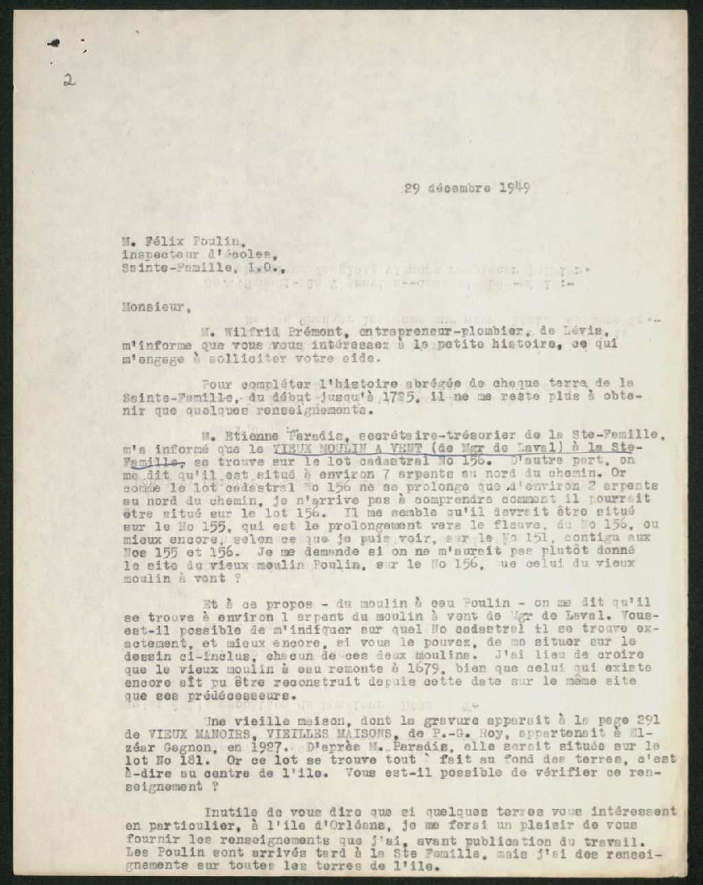 Lettre de Léon Roy, archiviste, à Félix Poulin, inspecteur d'école : Demande de renseignements, 29 décembre 1949, Archives nationales à Québec, Collection Seigneuries, (03Q,P240,D340,P2).