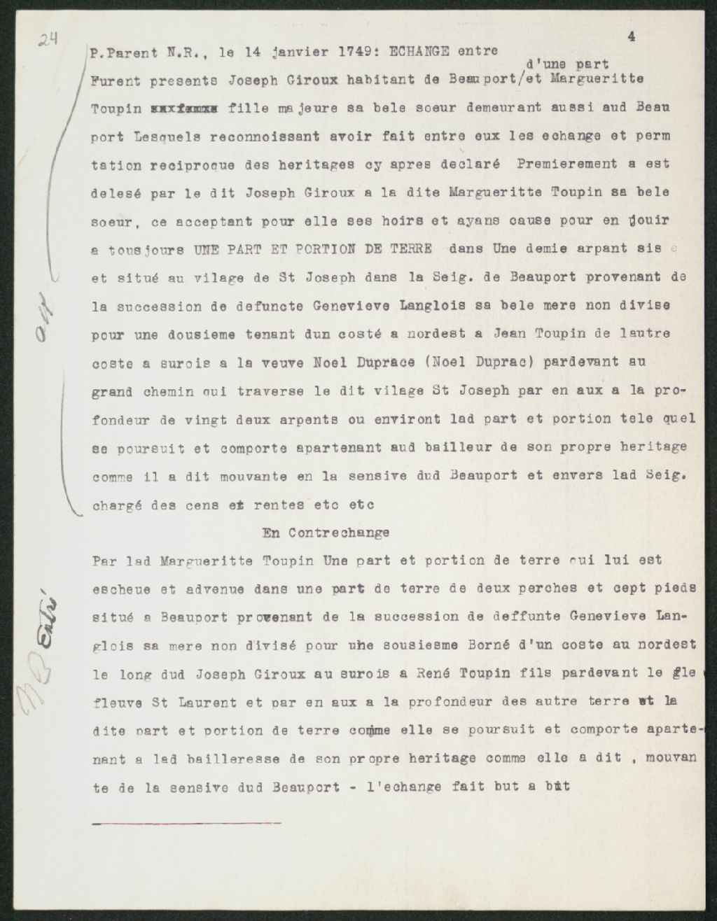 Échange entre Joseph Giroux et Marguerite Toupin, 14 janvier 1749, Archives nationales à Québec, Collection Seigneuries, (03Q,P240,D346,P24).