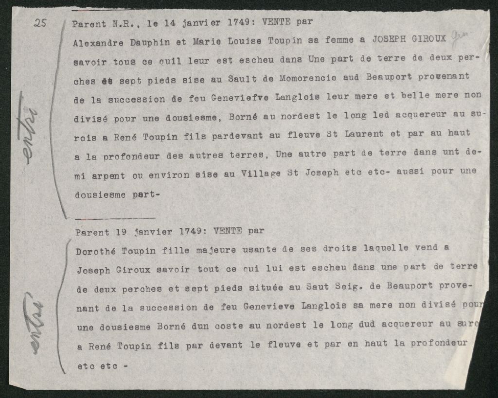 Vente par Alexandre Dauphin et Marie Louise Toupin à Joseph Giroux, 14 janvier 1749 et vente par Dorothé Toupin à Joseph Giroux, 19 janvier 1749