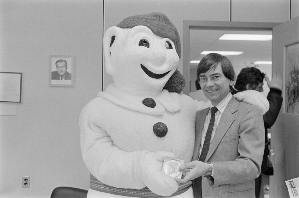 Visite des installations olympiques de Lake Placid par le Bonhomme Carnaval, 1980-01, Archives nationales à Québec, Fonds Ministère des Communications, (03Q,E10,S44,SS1,D80-46), Daniel Lessard.
