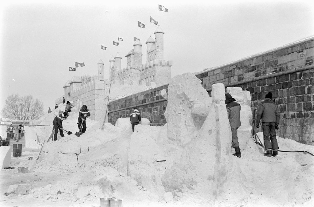 Concours international de sculpture sur glace et enfants jouant à Place Carnaval lors du Carnaval de Québec, 1980-02-02, Archives nationales à Québec, Fonds Ministère des Communications, (03Q,E10,S44,SS1,D80-111), Marc Lajoie.