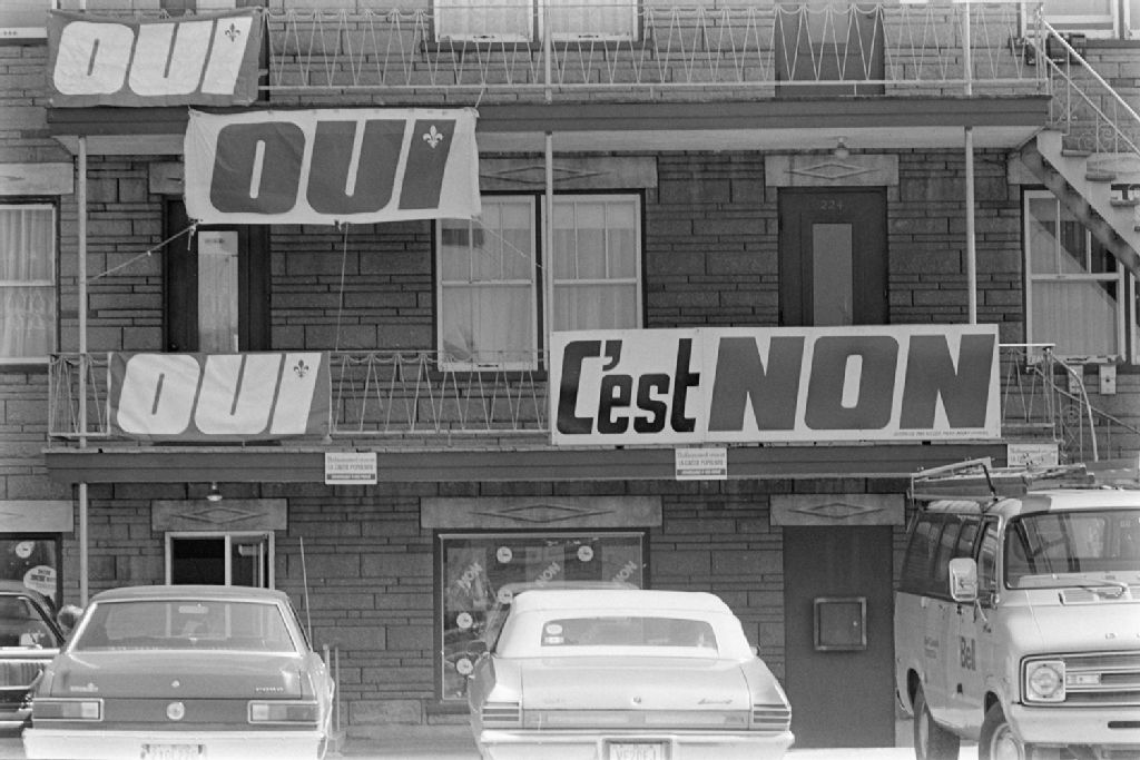 Référendum de 1980 ; affiches pour le oui et le non dans les rues et au comité central du non pour la région de Québec, 1980-05-18, Archives nationales à Québec, Fonds Ministère des Communications, (03Q,E10,S44,SS1,D80-329), Marc Lajoie.