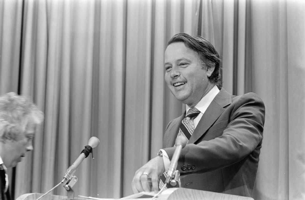 Conférence de presse des ministres Bernard Landry, Pierre-Marc Johnson et Pierre Marois sur l'octroi de nouveaux crédits au projet Opération de solidarité économique, 1980-06, Archives nationales à Québec, Fonds Ministère des Communications, (03Q,E10,S44,SS1,D80-441), Marc Lajoie.