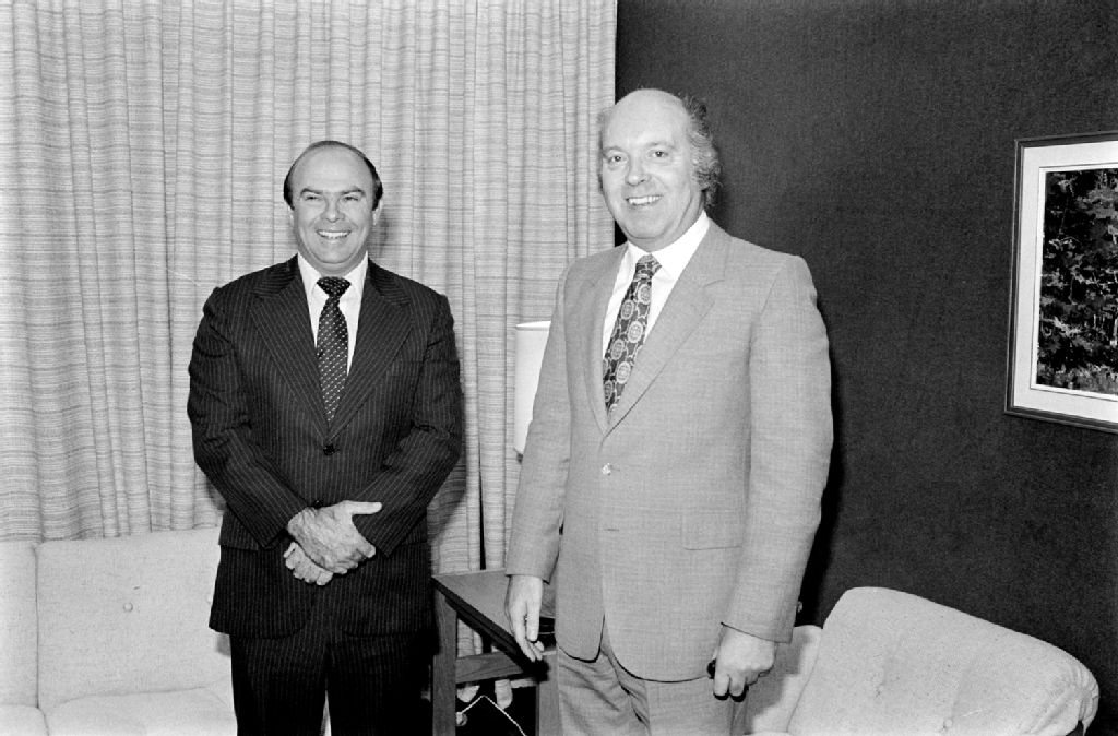 Rencontre entre Hippolito Mejin, ministre de l'Agriculture de la république Dominicaine et du ministre Claude Morin, 1980-10-16, Archives nationales à Québec, Fonds Ministère des Communications, (03Q,E10,S44,SS1,D80-677), Bernard Vallée.