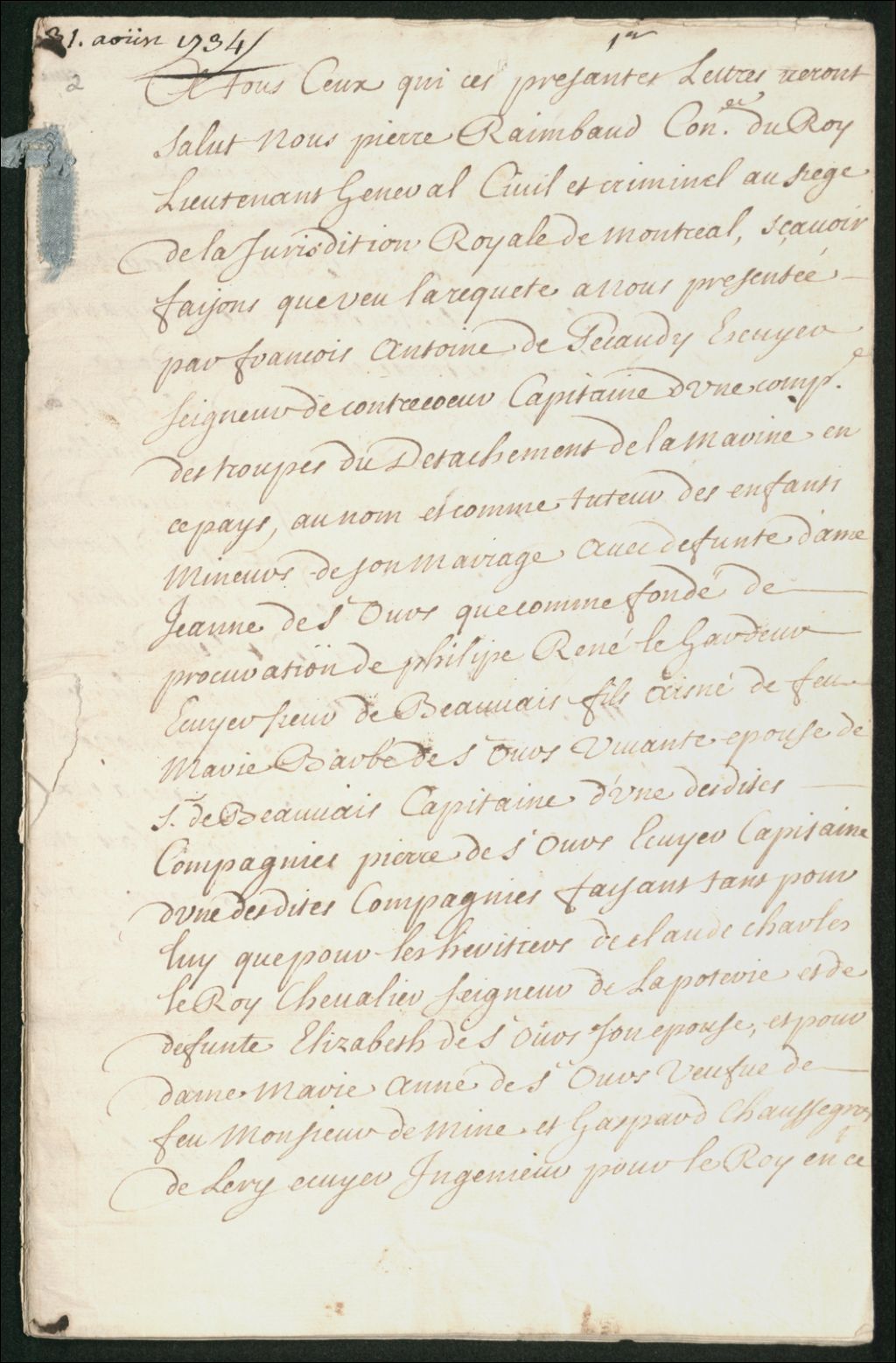 Acte de partage par devant le lieutenant-général civil et criminel de la juridiction royale de Montréal, à la requête de François-Antoine de Pécaudy de Contrecoeur, au nom et comme tuteur de ses enfants mineurs provenant de son mariage avec feue dame de Saint-Ours et aussi comme fondé de la procuration de Philippe-René Le Gardeur de Beauvais, fils aîné de feue Marie-Barbe de Saint-Ours, vivante épouse de M. de Beauvais, Pierre de Saint-Ours faisant tant pour lui que pour les héritiers de Claude-Charles Le Roy, chevalier de la Potherie, et de feue Elisabeth de Saint-Ours, son épouse, et pour dame Marie-Anne, veuve de feu M. de Mines, et Gaspard Chaussegros de Léry comme ayant épousé dame Marie Le Gardeur de Beauvais, tous héritiers de Pierre de Saint-Ours, tendante à ce qu'ayant fait division des terres et seigneuries de la succession du dit feu sieur et dame de Saint-Ours avec Jean-Baptiste de Saint-Ours Deschaillons, aîné du dit sieur de Saint-Ours, ils désireraient jouir à part et devis des terres à eux échues par le partage fait avec le dit sieur Deschaillons, par lequel il appert qu'il appartient aux dits sieurs de Léry et Beauvais, représentants la dite feue dame Marie-Barbe de Saint-Ours de Beauvais, auteur du comparant, un cinquième dans la moitié de la dite succession