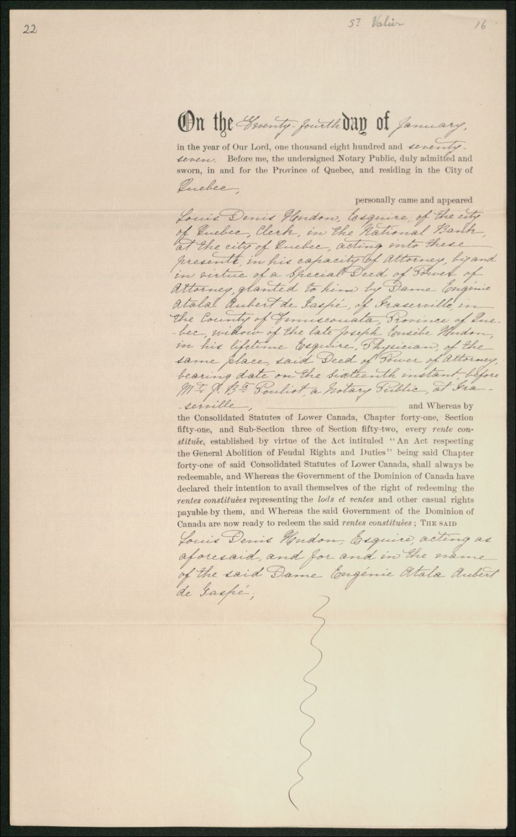 Quittance par Louis-Denis Hudon pour Eugénie-Atala Aubert de Gaspé, veuve de Joseph-Eusèbe Hudon, concernant la seigneurie de Saint-Vallier, envers Sa Majesté pour sa part de l'indemnité seigneuriale (Cadastre seigneuriale no 61), 24 janvier 1877, Archives nationales à Québec, Collection Seigneuries, (03Q,P240,D284,P22).