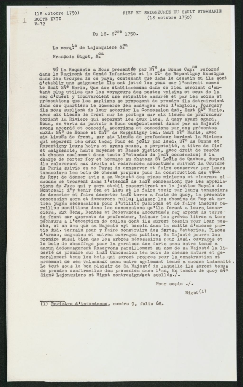 Le titre complet de ce document est : Acte de concession du marquis de la Jonquière et de François Bigot, gouverneur et intendant de la Nouvelle-France, à M. de Bonne, capitaine réformé dans le régiment de Condé-infanterie, et au chevalier de Repentigny enseigne dans les troupes de ce pays, " du Sault Saint-Marie, avec six lieues de front sur six lieues de profondeur, bordant la rivière qui sépare les deux lacs, pour en jouir par les dits sieurs de Bonne et de Repentigny à perpétuité, à titre de fief et seigneurie, haute, moyenne et basse justice.", 18 octobre 1750 (Copie dactylographiée).