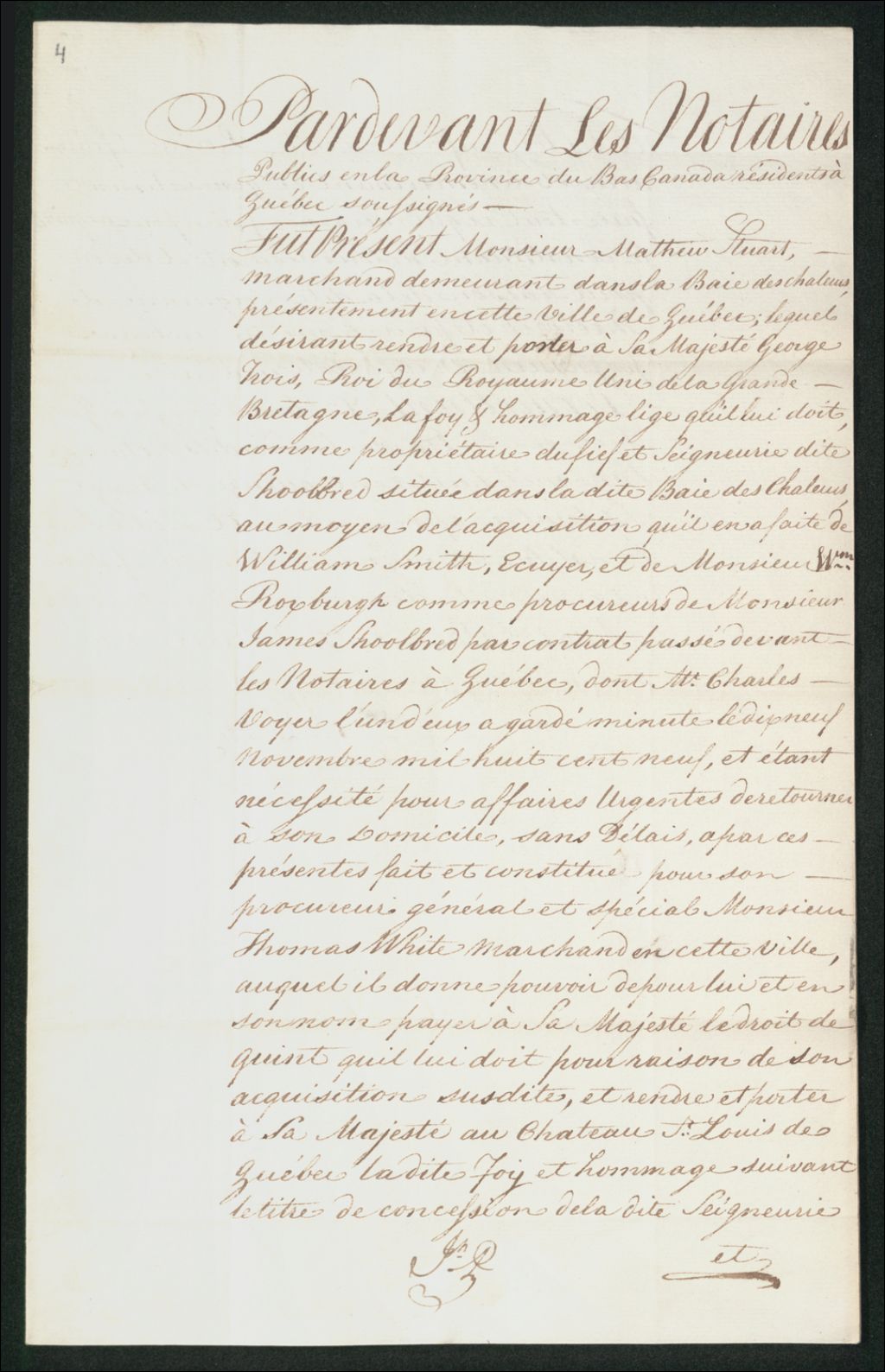 Procuration de Matthew Stuart à Thomas White, 20 septembre 1815, Archives nationales à Québec, Collection Seigneuries, (03Q,P240,D288,P4).