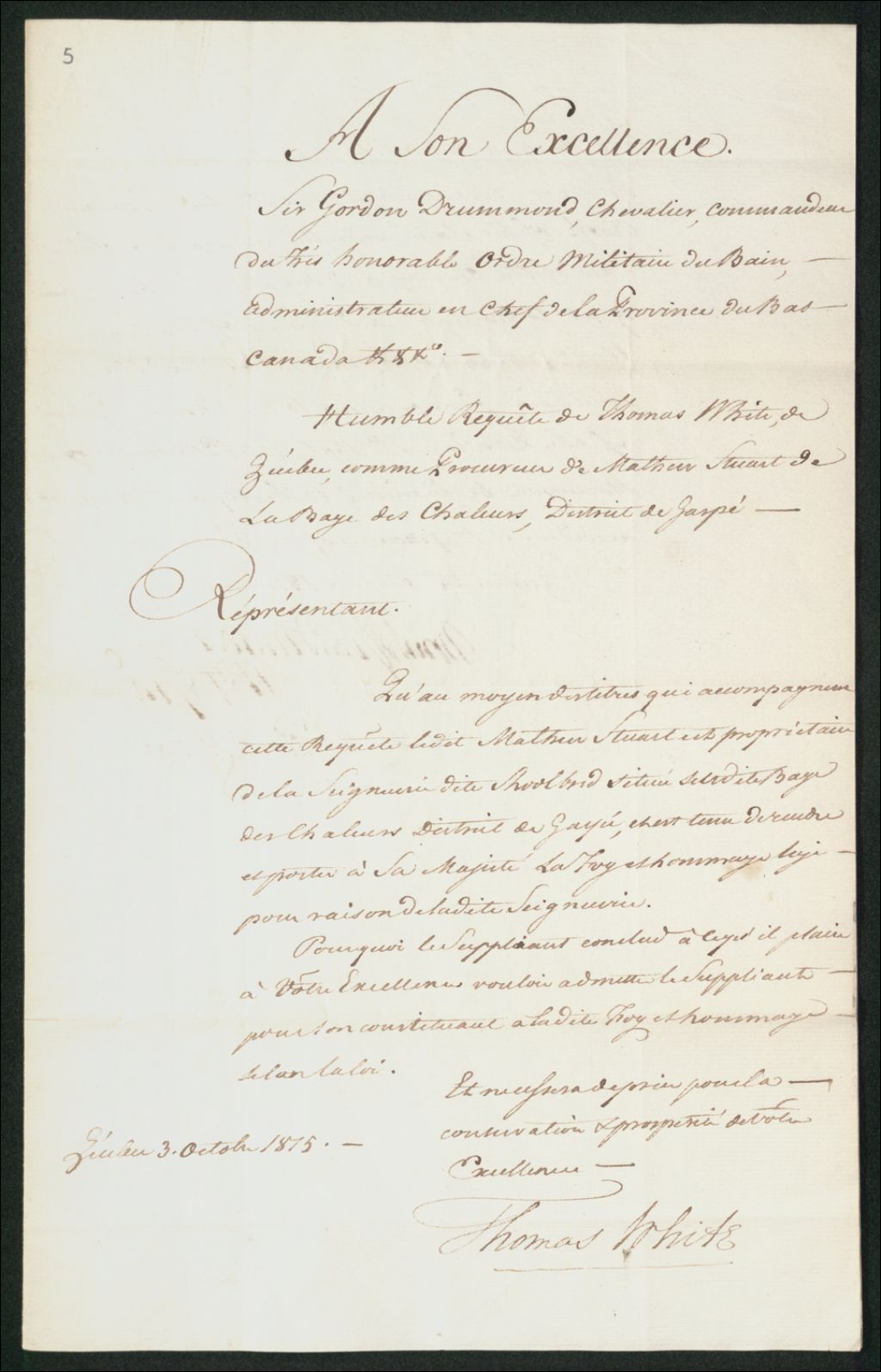 Requête et réponse à la requête de Thomas White comme procureur de Matthew Stuart : Admission à la foi et hommage, 3 octobre 1815, Archives nationales à Québec, Collection Seigneuries, (03Q,P240,D288,P5).