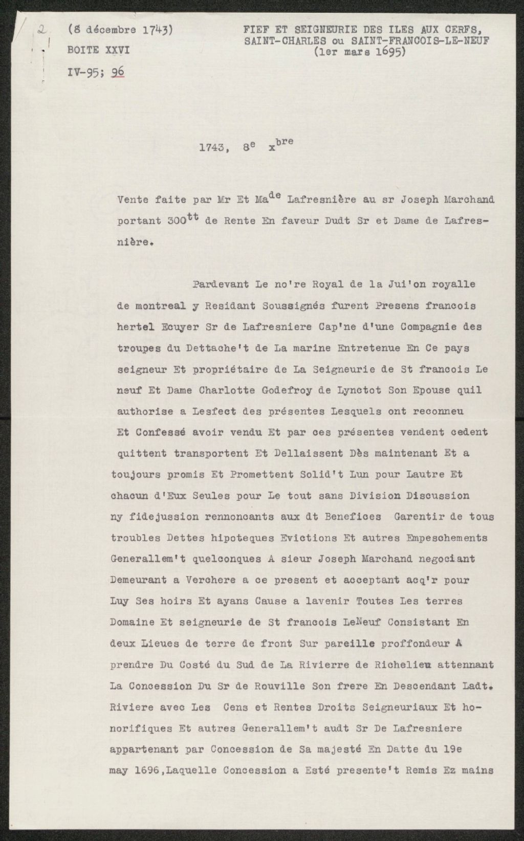 Vente par François Hertel de la Fresnière et Charlotte Godefroy de Lynctot (Lintot) à Joseph Marchand, 8 décembre 1743, Archives nationales à Québec, Collection Seigneuries, (03Q,P240,D324,P2).