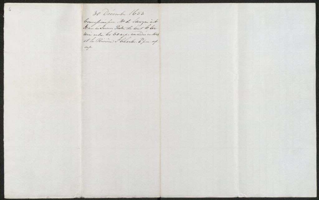 Acte de concession de M. de Lauzon à Jean Le Sueur de tout le terrain entre les 50 arpents concédés en 1646 et la rivière Saint-Charles, 30 décembre 1653, Archives nationales à Québec, Collection Seigneuries, (03Q,P240,D334,P6).