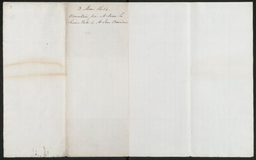 Acte de donation de Jean Le Sueur, écuyer, prêtre, curé de Saint-Sauveur, à maître Jean Bourdon, seigneur de Saint-Jean, des concessions qu'il a reçues de la Compagnie de la Nouvelle-France les 31 octobre 1646 et 30 décembre 1653, 3 mai 1654. Copie. (Manuscrit)., 3 mai 1654, Archives nationales à Québec, Collection Seigneuries, (03Q,P240,D334,P7).