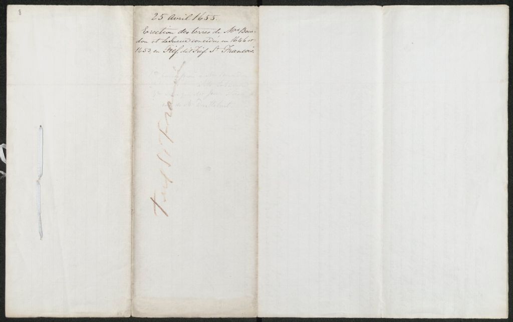 Acte d'érection en fief noble par Jean de Lauzon, en faveur de Jean Bourdon, "de ce qu'il possède en roture en un terrain au lieu dit Saint-François, à la côte Sainte-Geneviève, tenant à la concession des Sauvages avec ce qu'il a eu du sieur Le Sueur et ce qui se rencontre de terre en arrière la concession du sieur Gloria faisant part de la Commune jusqu'à la rivière Saint-Charles.", 25 avril 1655, Archives nationales à Québec, Collection Seigneuries, (03Q,P240,D334,P8).
