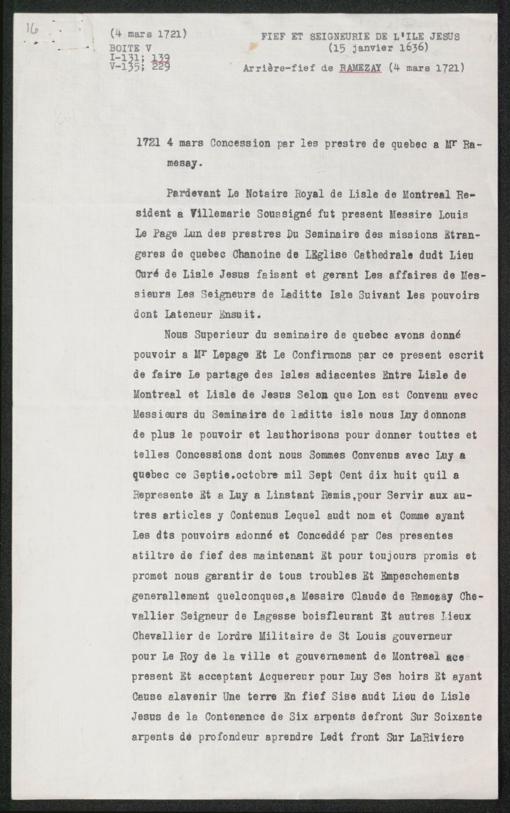 - Le titre complet de la pièce se lit comme suit : Acte de concession de messire Louis Lepage, l'un des prêtres du séminaire de Québec, curé de l'île Jésus, porteur de la procuration des messieurs du séminaire de Québec, à messire Claude de Ramezay, chevalier de Saint-Louis, gouverneur de la ville et gouvernement de Montréal, "d'une terre en fief sise au lieu de l'île Jésus de la contenance de six arpents de front sur soixante arpents de profondeur, à prendre le front sur la rivière des Prairies, par derrière aux terres des dits seigneurs non concédées, d'un côté à ... d'autre côté à ... à perpétuité et comme dépendant du fief dominant de l'île Jésus.