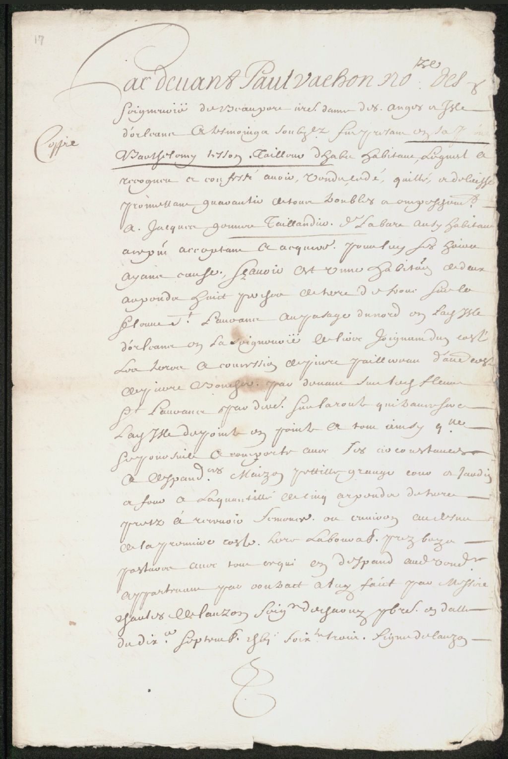 Vente par Bertellemy (Barthélémy) Tesson à Jacques Genest dit Labarre: Île d'Orléans, seigneurie de Liret., Copie (original créé le 14 mars 1666), Archives nationales à Québec, Collection Seigneuries, (03Q,P240,D258,P17).