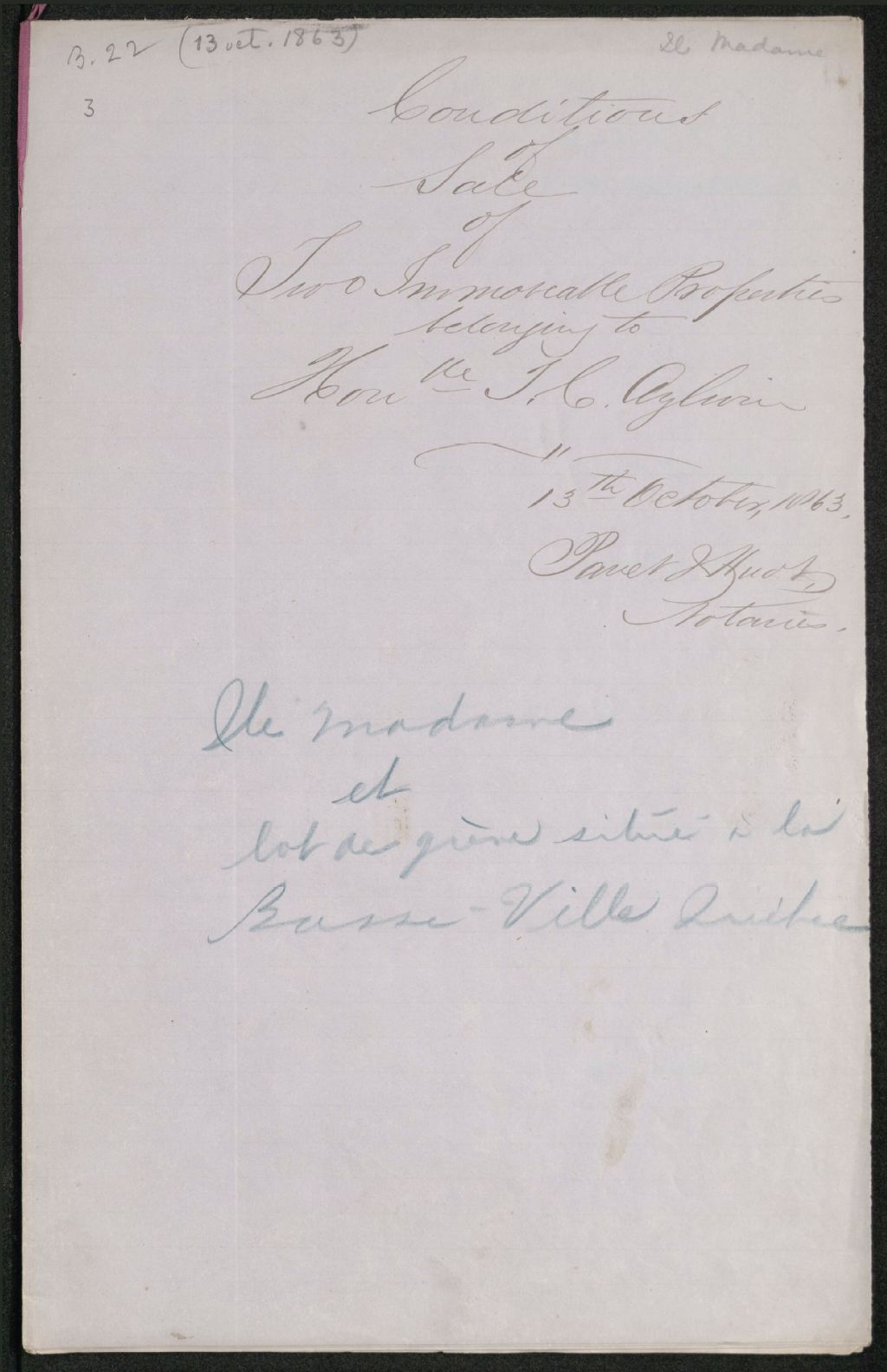- Conditions de vente de deux propriétés immobilières appartenant à J. C. Aylwin [?] : Île Madame et lot de grève situé à la basse-ville de Québec