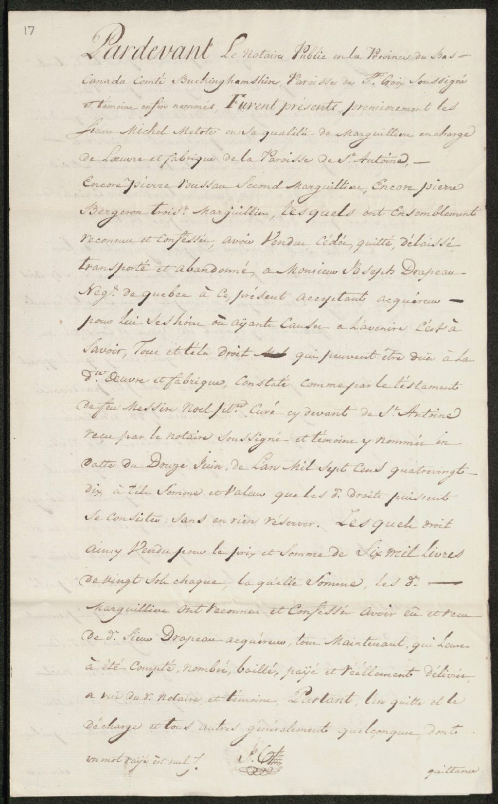 Vente par les marguilliers de la paroisse de Saint-Antoine à Joseph Drapeau