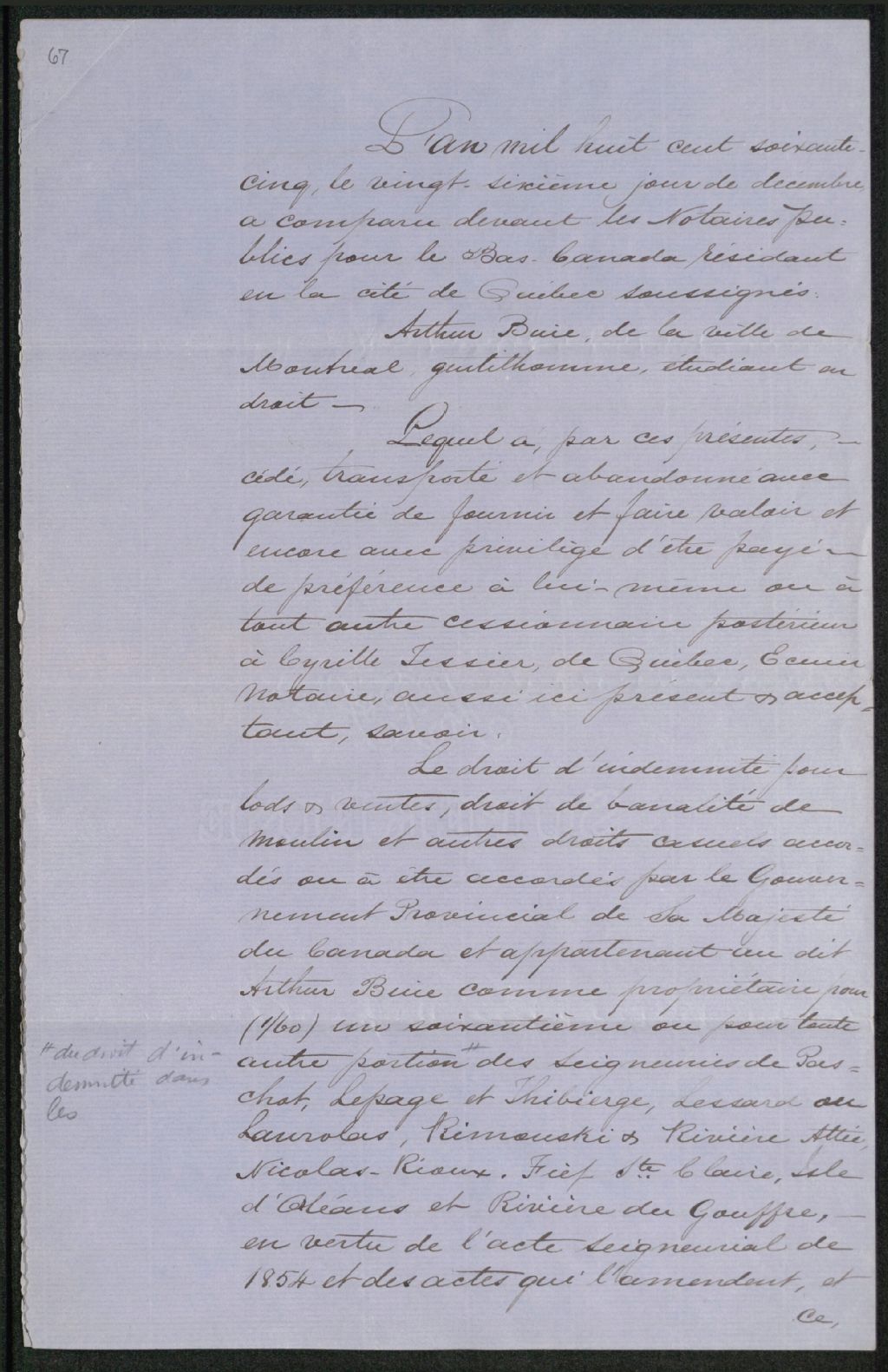 Transport par Arthur Buie à Cyrille Tessier, 26 décembre 1865, Archives nationales à Québec, Collection Seigneuries, (03Q,P240,D260,P67).