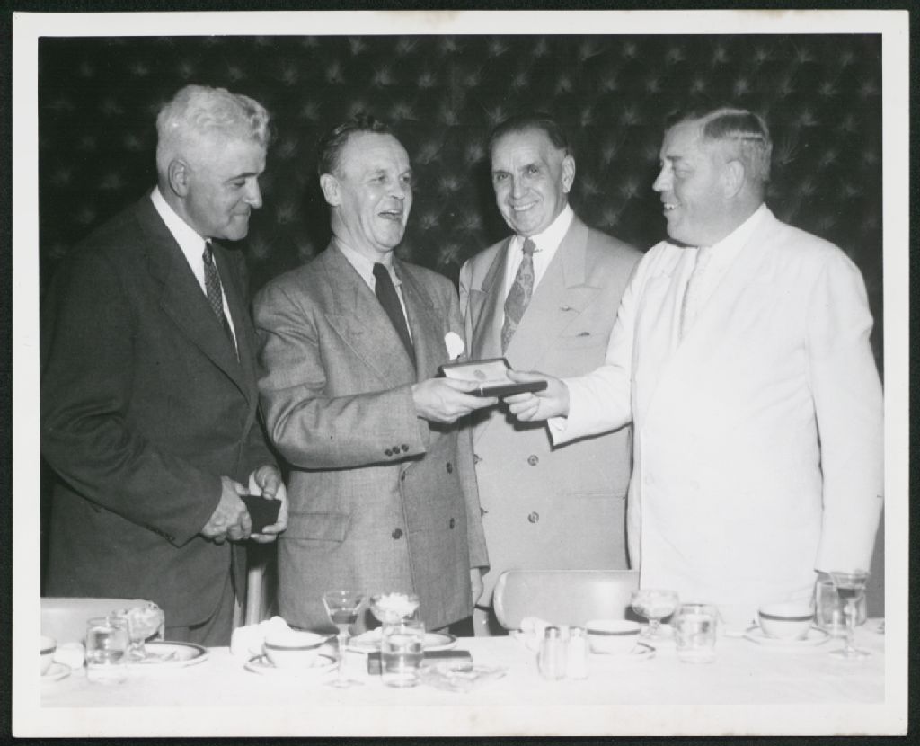 Portrait de groupe avec Jean-Louis Baribeau, [195-?], Archives nationales à Trois-Rivières, Fonds Union musicale des Trois-Rivières, (04T,P47,S1,P41), Photographe non identifié.
