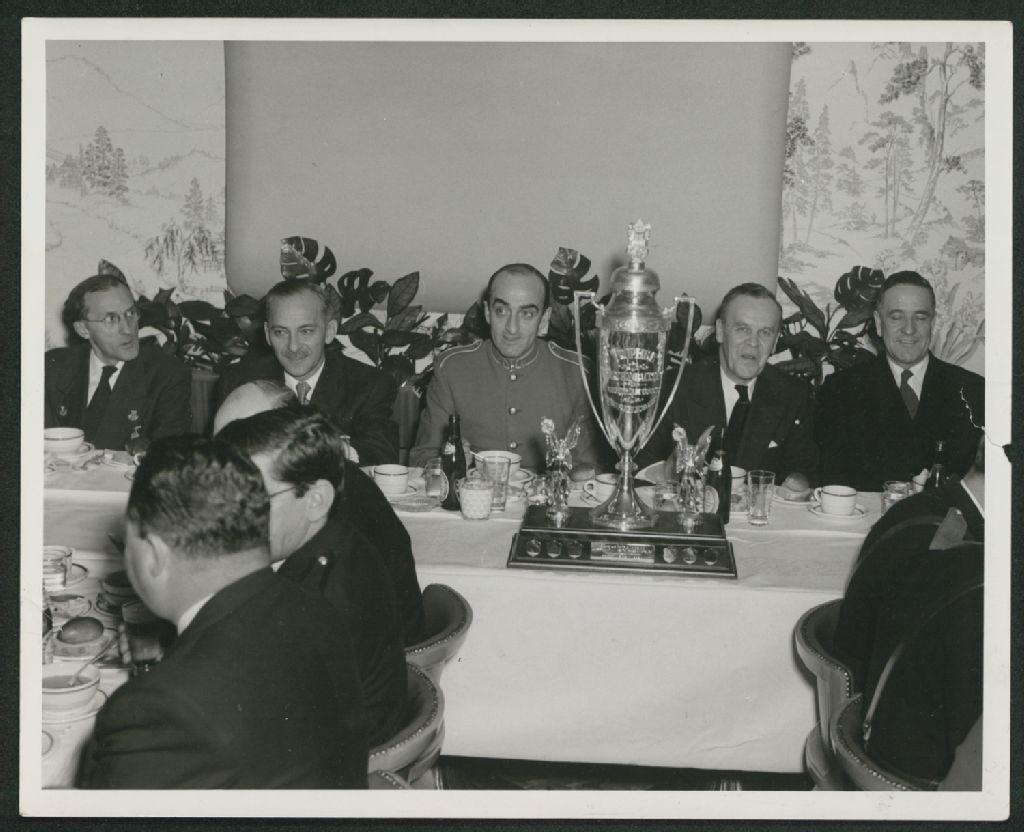 - À l'extrémité gauche : Henry Kemp, de l'Union musicale de Trois-Rivières. À droite du trophée : Jean-Louis Baribeau.