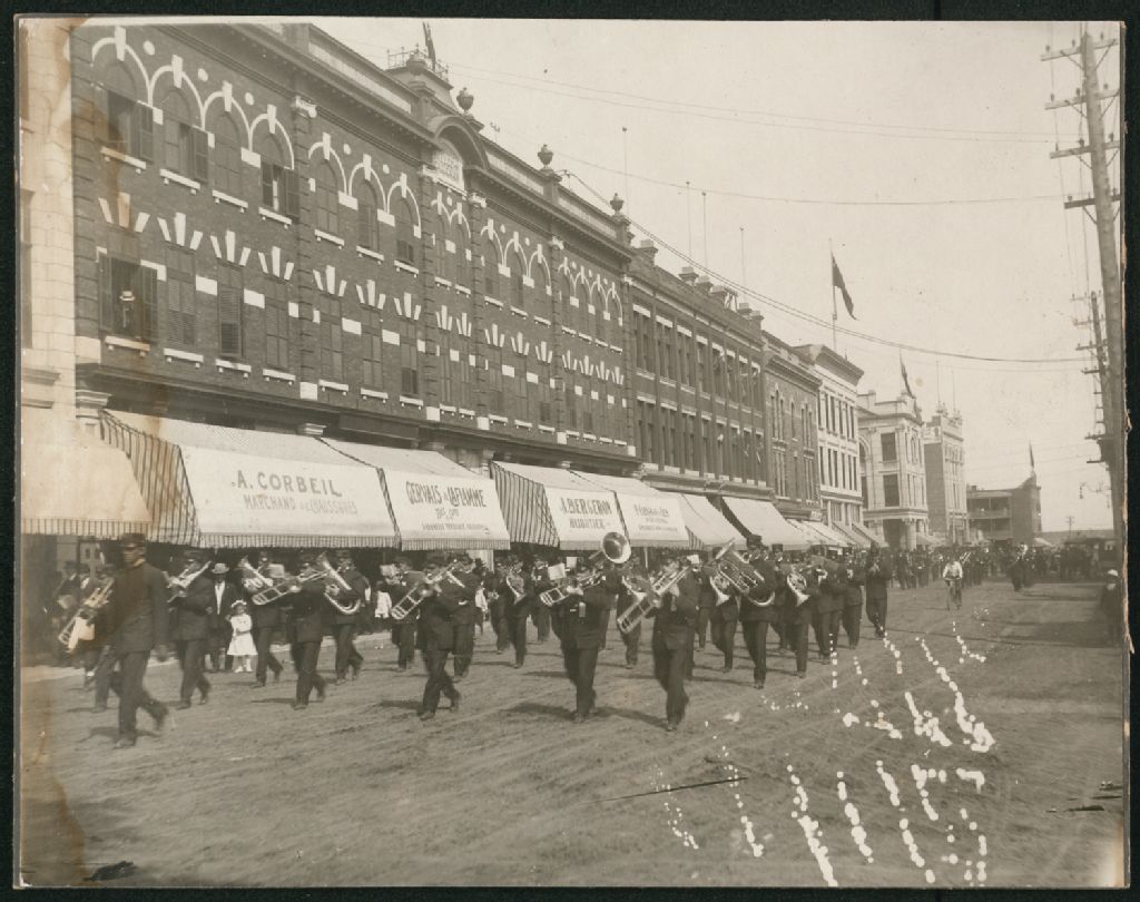 Défilé de l'Union musicale des Trois-Rivières sur la rue des Forges, [Entre 1908 et 1914], Archives nationales à Trois-Rivières, Fonds Union musicale des Trois-Rivières, (04T,P47,S1,P72), Photographe non identifié.