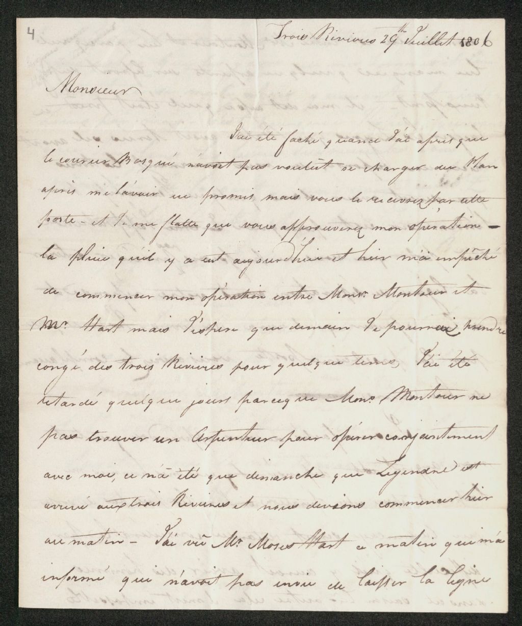 Lettre de Benjamin ?, écuyer : litige autour de l'arpentage d'une ligne de séparation. Concerne Moses Hart. 29 juillet 1806 (Manuscrit)., 29 juillet 1806, Archives nationales à Québec, Collection Seigneuries, (03Q,P240,D306,P4).