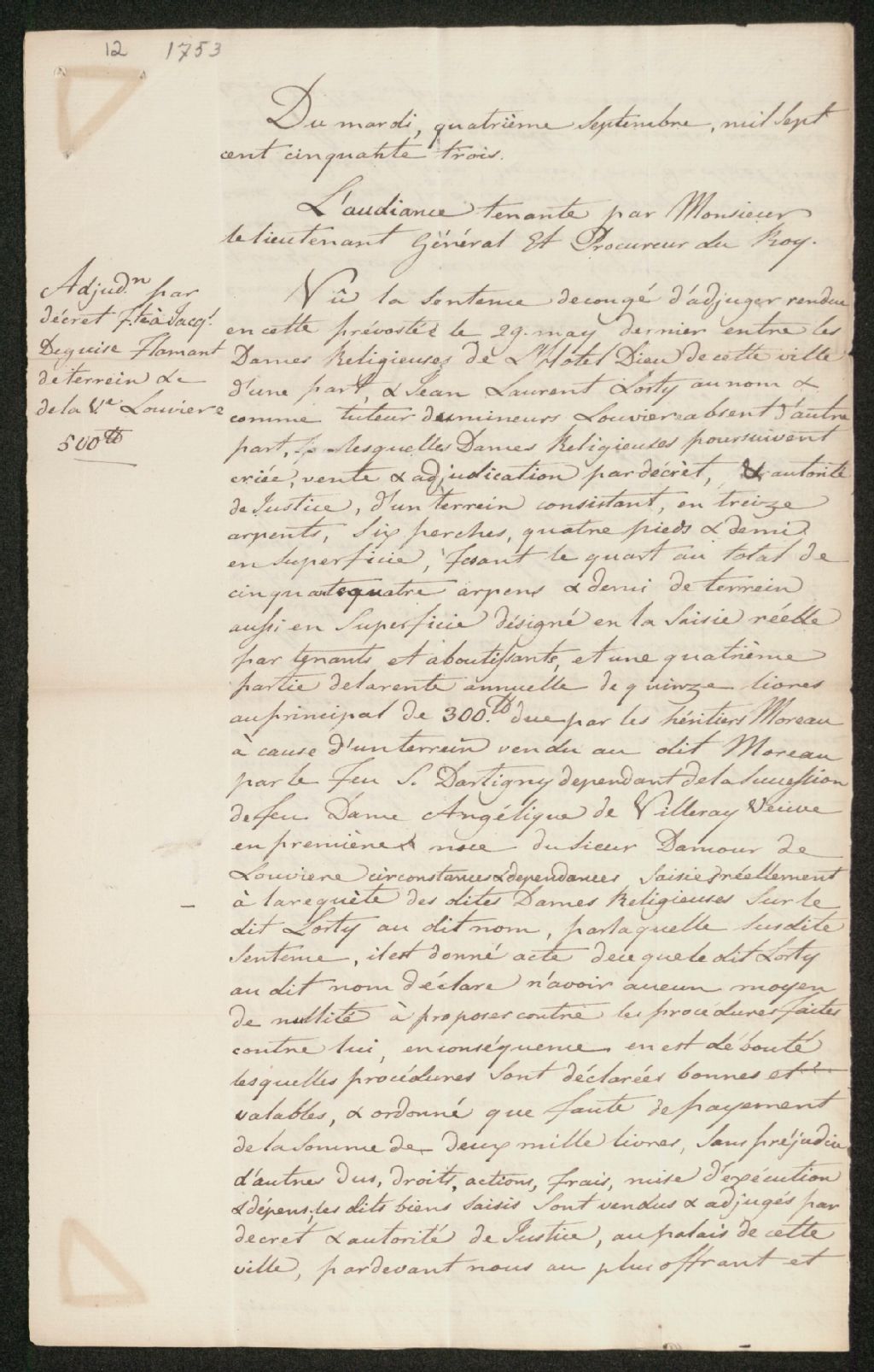 Adjudication par décret en faveur de Jacques Déguire Flamant et la veuve Louvière, 4 septembre 1753, Archives nationales à Québec, Collection Seigneuries, (03Q,P240,D308,P12).