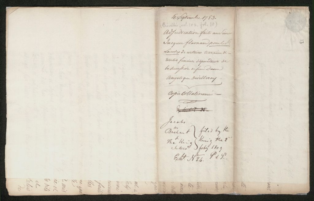 Adjudication en faveur de Jacques Flamant pour le sieur Lacroix : Biens de la succession de Dame Angélique de Villeray, 4 septembre 1753, Archives nationales à Québec, Collection Seigneuries, (03Q,P240,D308,P13).
