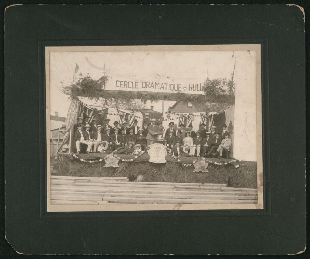 - Les clichés montrent les membres (env. 30 hommes) du Cercle, assis et debouts sur l'estrade, quelqu'un debout au centre près dun gros appareil photo au centre; une large banderole du Cercle Dramatique de Hull identifie le stand