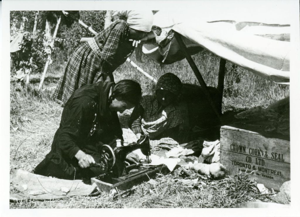 Trois femmes autochtones dont une manipulant une machine à coudre manuelle