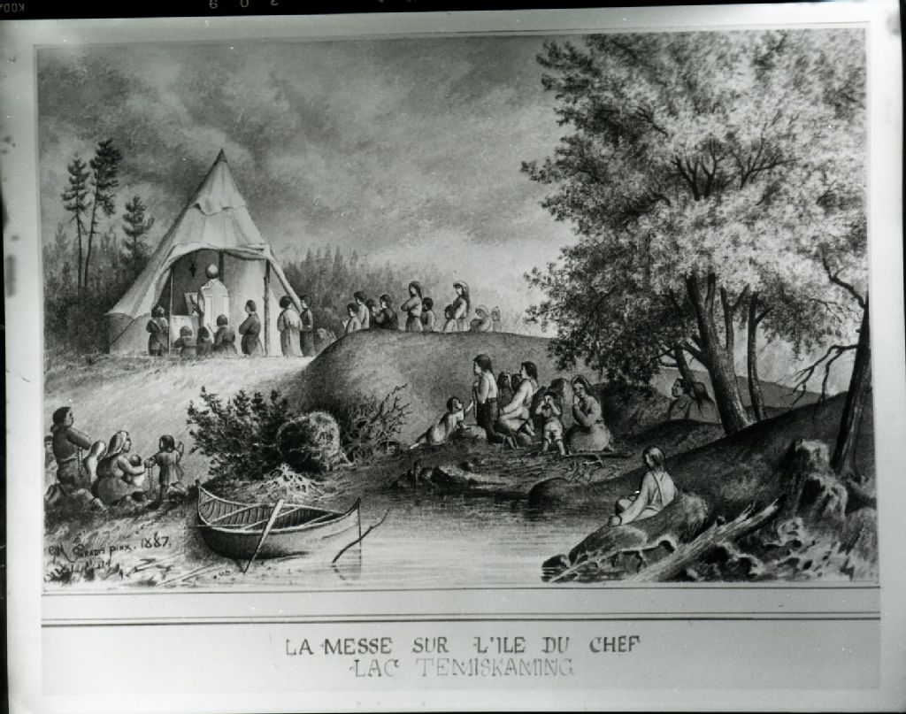 La messe sur l'île du chef. Lac Temiscaming, 10 octobre 1978, Archives nationales à Rouyn-Noranda, Fonds Gaston Carrière, (08Y,P11,P24), Photographe non identifié.