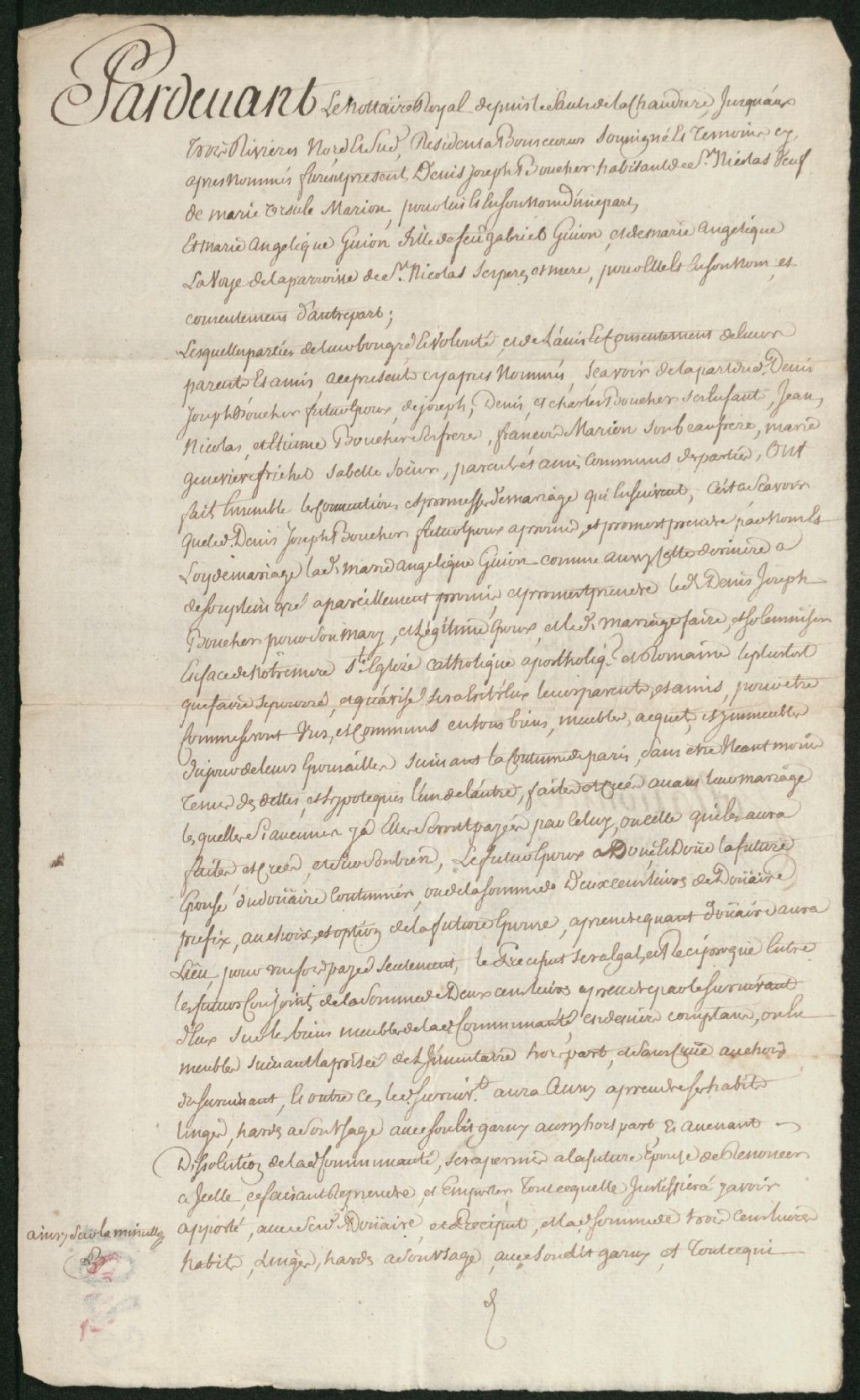 - Ce dossier en matières civiles provient de la Cour des plaidoyers communs. Il comprend un contrat de mariage passé pardevant maître Choret, notaire, entre Denis-Joseph Boucher, habitant de Saint-Nicolas, veuf de Marie-Ursule Marion (dit Lafontaine), et Marie-Angélique Guion (Guyon), fille de feu Gabriel Guion (Guyon) et Marie-Angélique Lavoye (Lavoie), ses père et mère, de la paroisse de Saint-Nicolas ; une requête de Denis-Joseph Boucher et d'Angélique Guion (Guyon), mari et femme, réclamant à leurs enfants, Joseph Boucher, Charles Boucher, Jean-Baptiste Boucher, François Boucher, François Bourassa, comme ayant épousé Marie Boucher, et Jean-Baptiste Bourassa, comme ayant épousé Marie-Ursule Bouche, le paiement d'une pension alimentaire en échange de l'abandon de tous leurs biens ; un mandat d'assignation (warrant) à Joseph Boucher, Charles Boucher, Jean-Baptiste Boucher, François Boucher et François Bourassa, comme ayant épousé Marie Boucher ; un exploit d'assignation en conséquence ; un jugement de la Cour des playdoyers communs condamnant les défendeurs à payer une pension alimentaire à Denis-Joseph Boucher et Marie-Angélique Guyon, leurs père, mère, beau-père et belle-mère, en échange de l'abandon de tous leurs biens ; un procès-verbal d' établissement de la nature de la pension alimentaire et des biens qui doivent la composer, fait par Jean-Baptiste Demers, bailli, en présence de René Simono (Simoneau), Joseph Saint-Laurent, Joseph Bergeront (Bergeron), Charles-François Bouché (Boucher), Michel Demer (Demers) et François Gagnont (Gagnon), témoins, et aussi en présence de Jean-Baptiste Drappo (Drapeau), bailli, et de Denis Frichet, bailli