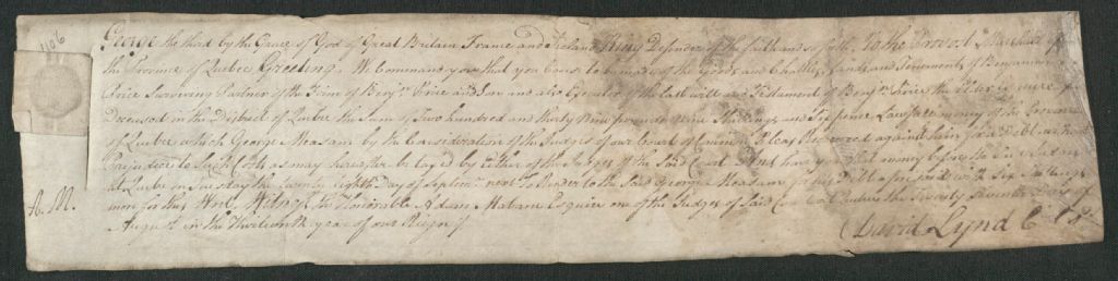 Procès conjoint entre les créanciers de la compagnie Benjamin Price and son, à savoir Timothy Hurst et Charles Hurst, et aussi George Measam, marchand, d'une part, et Benjamin Price fils, partenaire survivant de la compagnie Benjamin Price and Son, au nom et comme exécuteur testamentaire de Benjamin Price, son défunt père, originaire de Londres, d'autre part, 24 avril 1770 - 5 octobre 1773, Archives nationales à Québec, Fonds Cour des plaidoyers communs du district de Québec, (03Q,TL24,S1,D1106).