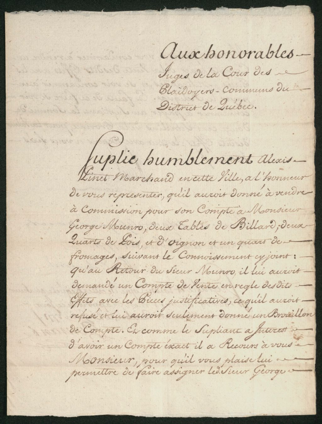 Procès entre Alexis Pinet, marchand en la ville de Québec, d'une part, et George Munroe (Munro - Monroe), négociant, d'autre part, à propos du paiement d'une somme de 1200 shillings de la province de Québec, due pour la valeur de deux tables de billard, deux quarts de pois et d'oignons et un quart de fromage que ledit George Munroe (Munro - Monroe) a vendus à commission pour le compte du demandeur, et pour lesquelles ventes il refuse de fournir des pièces justificatives et un compte en règle, 28 juin 1771 - 27 juillet 1771, Archives nationales à Québec, Fonds Cour des plaidoyers communs du district de Québec, (03Q,TL24,S1,D1133).