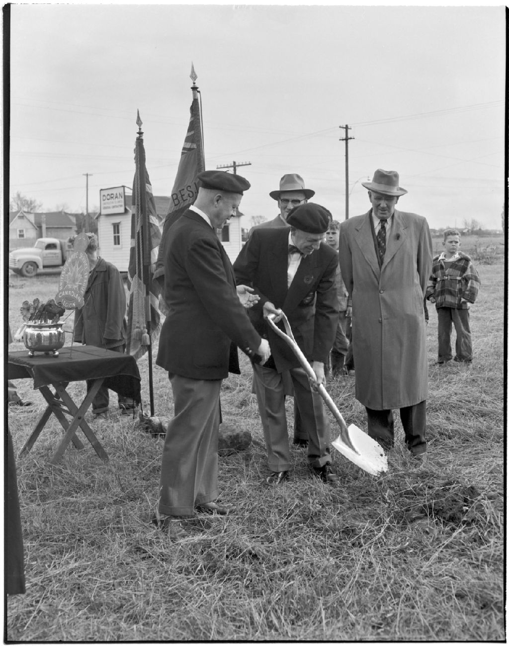 Première pelletée de terre par les vétérans pour la construction d'un logement pour les anciens combattants, 3 novembre 1954, Archives nationales à Gatineau, Fonds Champlain Marcil, (07H,P174,S1,D4181), Attribuée à Champlain Marcil.