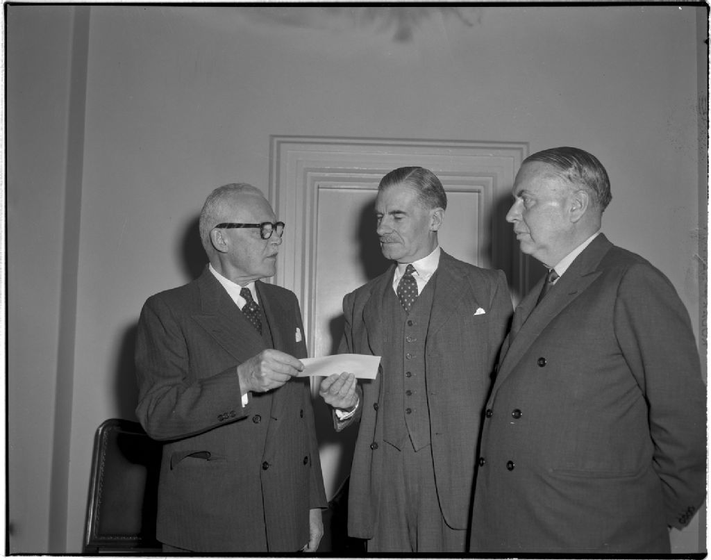 Remise de chèques, 3 novembre 1954, Archives nationales à Gatineau, Fonds Champlain Marcil, (07H,P174,S1,D4184), Attribuée à Champlain Marcil.