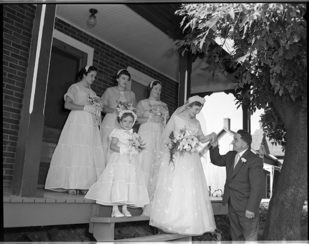 Mariage d'Odette Lacroix et J.P. Lalonde à Hammond, 2 août 1954, Archives nationales à Gatineau, Fonds Champlain Marcil, (07H,P174,S1,D3648), Attribuée à Champlain Marcil.