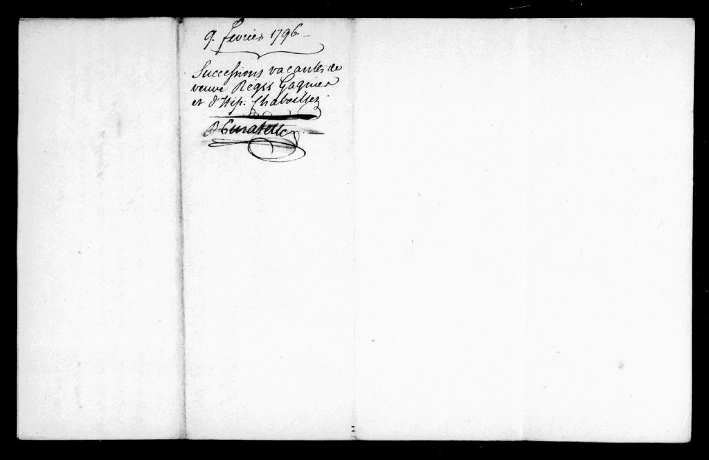 Curatelle des successions vacantes de défunte Ursule Hurtubise, veuve de Régis Gagnier [Régis Gagnier] et de la communauté biens entre Hippolyte Chaboillez [Hippolyte Chaboyer] et Marie Anne Gagnier [Marie Anne Gagné], 9 février 1796, Archives nationales à Montréal, Fonds Cour supérieure. District judiciaire de Montréal. Tutelles et curatelles, (06M,CC601,S1,SS2,D1032).