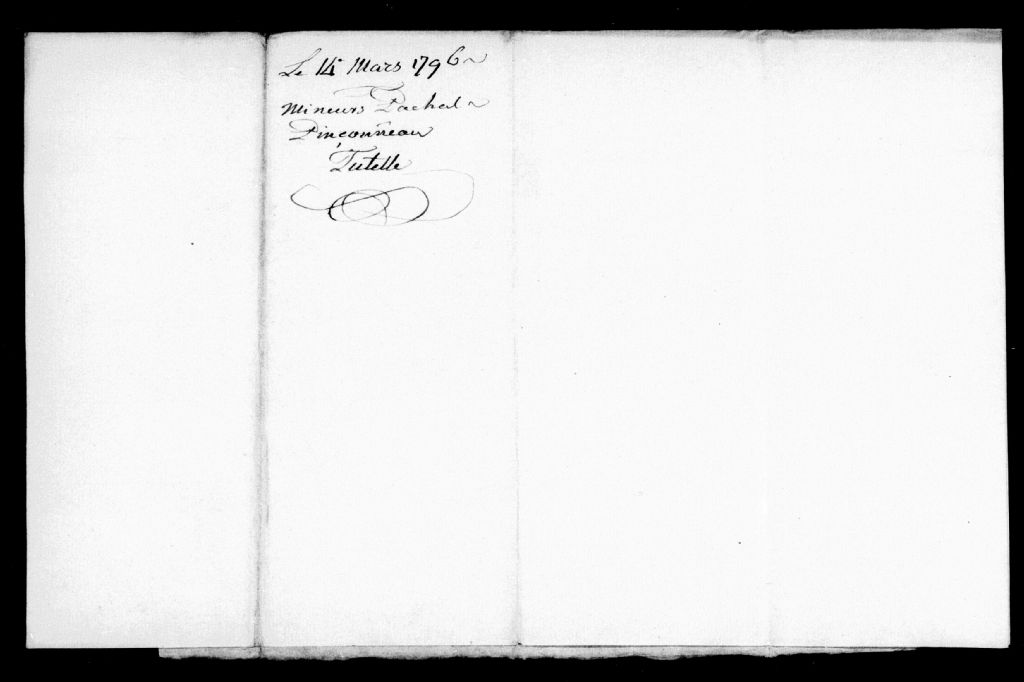 Tutelle de(s) enfant(s) mineur(s) de défunte Charlotte Pétrimoulx et de Paschal Pinsonneau [Pascal Pinsonneault], 14 mars 1796, Archives nationales à Montréal, Fonds Cour supérieure. District judiciaire de Montréal. Tutelles et curatelles, (06M,CC601,S1,SS2,D1085).