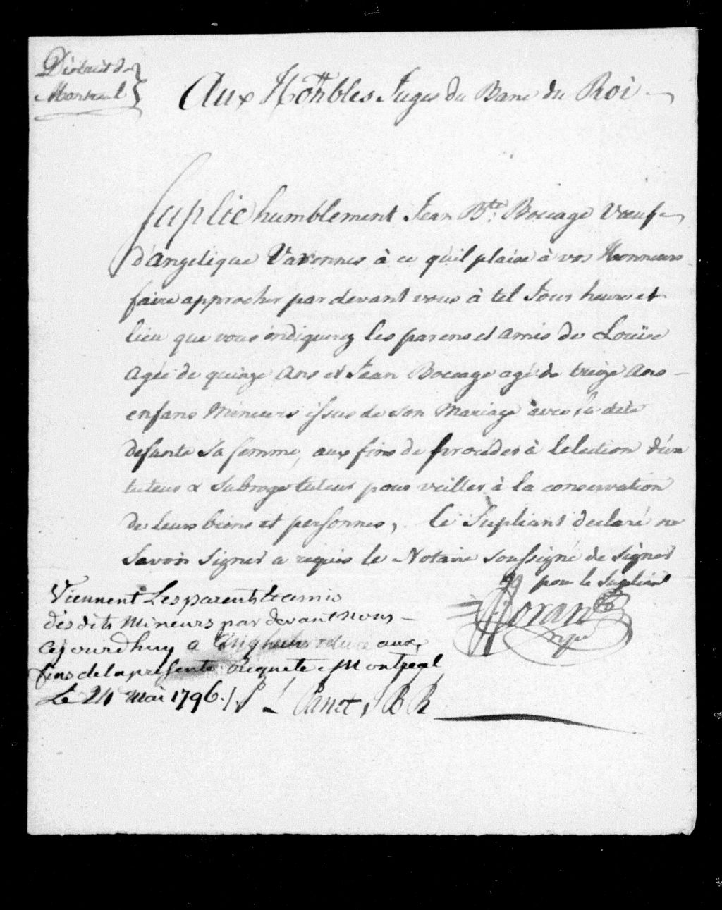 Tutelle de(s) enfant(s) mineur(s) de défunte Angélique Varennes [Angélique Gérard de Varennes] et de Jean Baptiste Bocage [Jean Baptiste Baillargeon Bocage], 24 mai 1796, Archives nationales à Montréal, Fonds Cour supérieure. District judiciaire de Montréal. Tutelles et curatelles, (06M,CC601,S1,SS2,D1128).