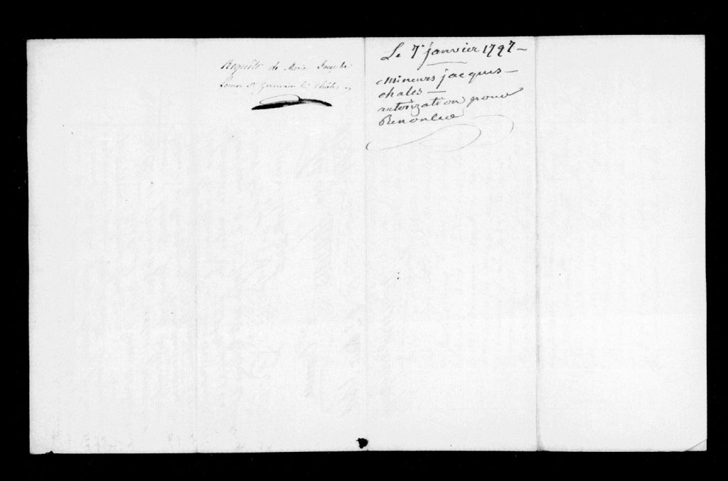 Curatelle de la succession vacante de Jacques Châle [Jacques Chasle], 7 janvier 1797, Archives nationales à Montréal, Fonds Cour supérieure. District judiciaire de Montréal. Tutelles et curatelles, (06M,CC601,S1,SS2,D1320).