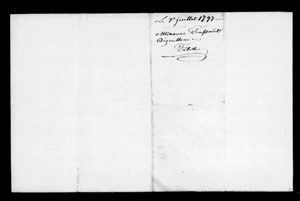 Tutelle de(s) enfant(s) mineur(s) de défunte Geneviève Gauvreau et de Toussaint Bizaillon [Toussaint Bisaillon], 7 juillet 1797, Archives nationales à Montréal, Fonds Cour supérieure. District judiciaire de Montréal. Tutelles et curatelles, (06M,CC601,S1,SS2,D1456).