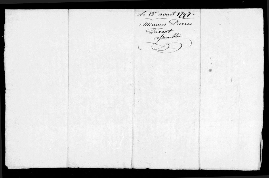 Tutelle de(s) enfant(s) mineur(s) de défunte Marie Pélagie Perrault et de Pierre Turcot - Administration tutélaire, 4 août 1797-18 août 1797, Archives nationales à Montréal, Fonds Cour supérieure. District judiciaire de Montréal. Tutelles et curatelles, (06M,CC601,S1,SS2,D1516).