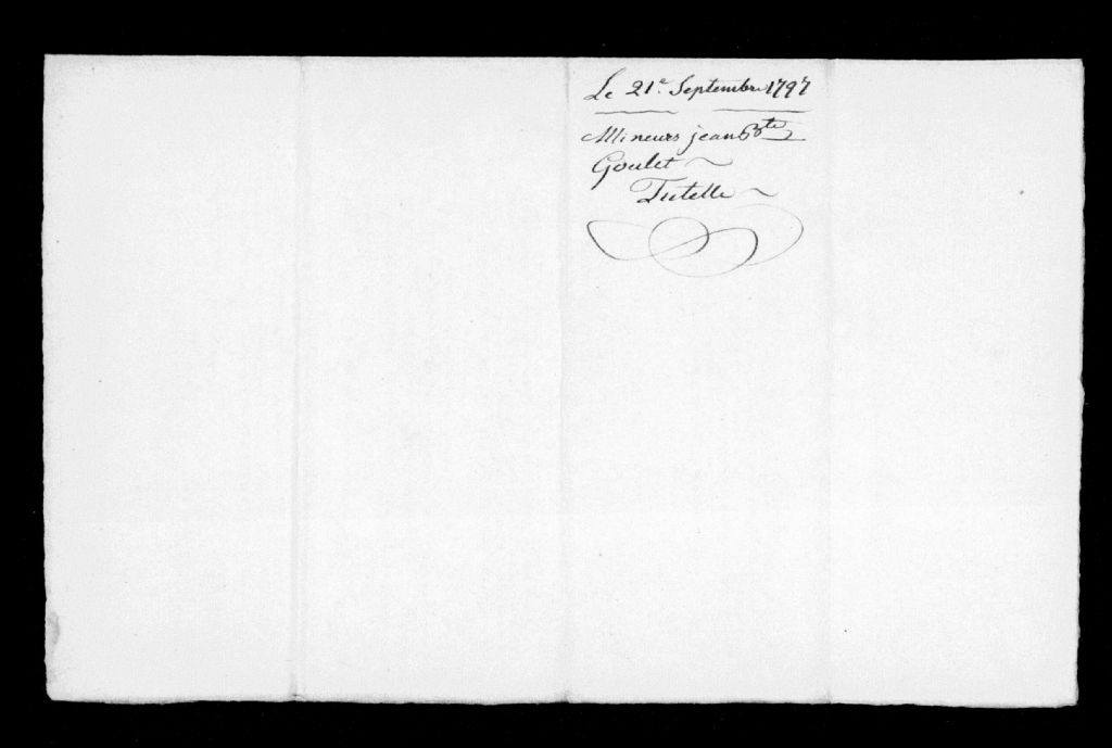 Tutelle de(s) enfant(s) mineur(s) de défunt Jean Baptiste Goulet et de Marie Anne Éthier, 21 septembre 1797, Archives nationales à Montréal, Fonds Cour supérieure. District judiciaire de Montréal. Tutelles et curatelles, (06M,CC601,S1,SS2,D1540).