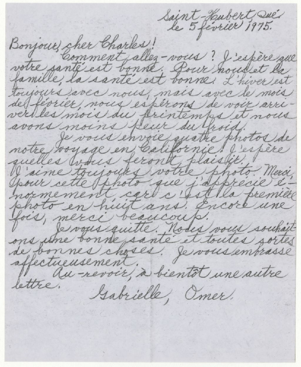 Correspondance d'Omer et Gabrielle Ratté (Pellerin) à Charles de Bruyne, 5 février 1975