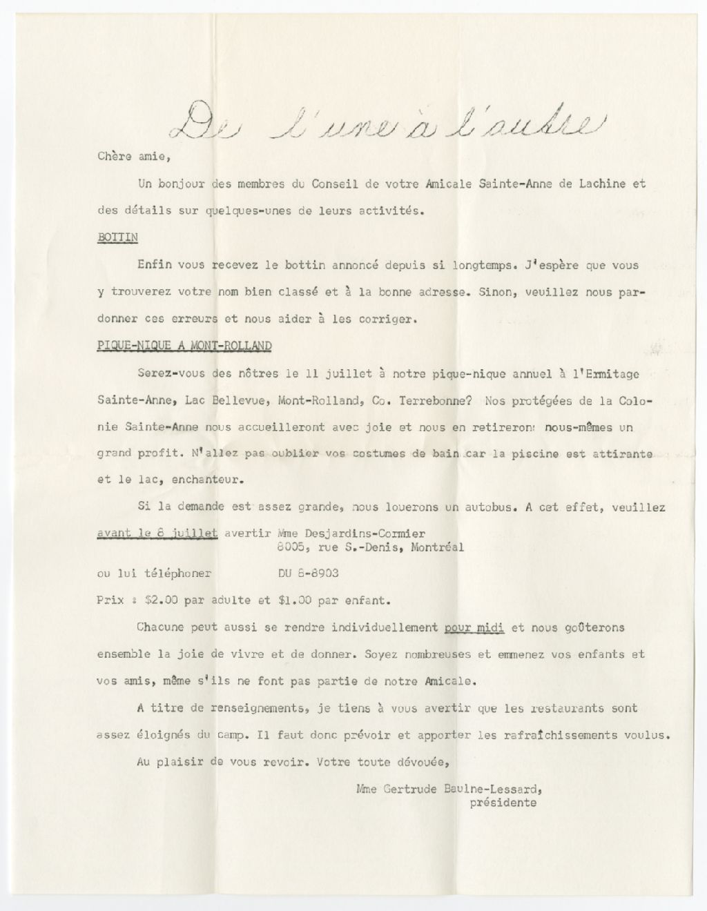Lettre de Gertrude Baulne-Lessard