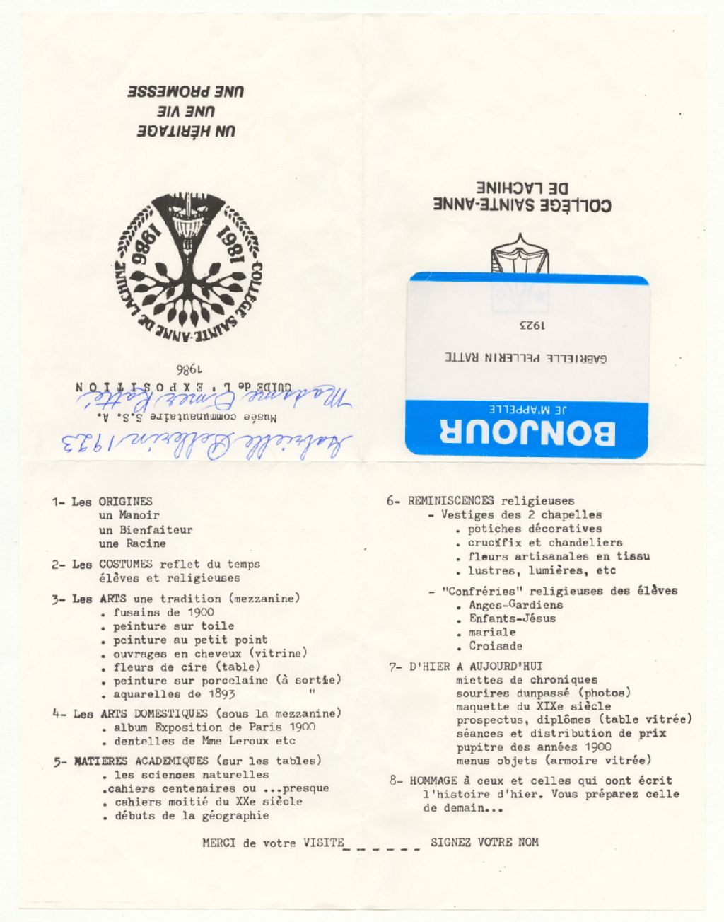 Table des matières du guide de l'exposition sur le Collège Sainte-Anne de Lachine au Musée communautaire des Soeurs de Sainte-Anne