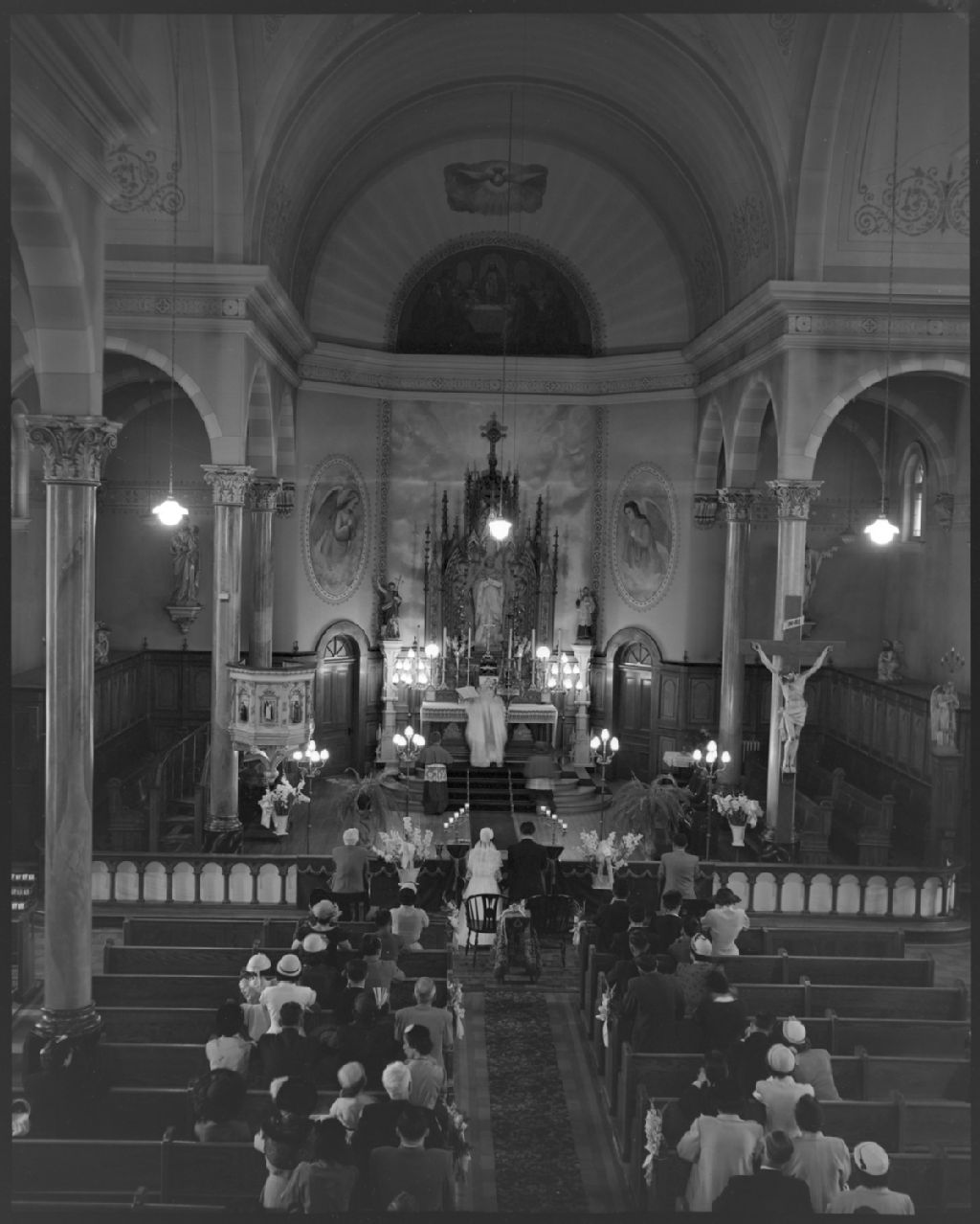 Mariage de Gérald Séguin et de Irène Lamarche à l'Église Saint-Charles de Vanier, Ontario, 4 août 1952, Archives nationales à Gatineau, Fonds Champlain Marcil, (07H,P174,S1,D1329), Attribuée à Champlain Marcil.